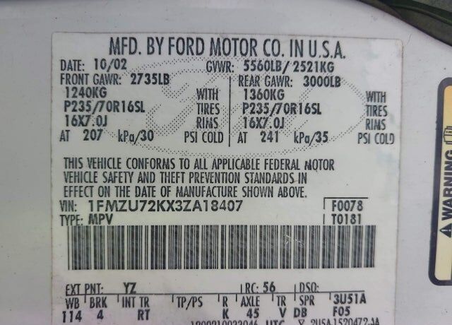VIN 1FMZU72KX3ZA18407 may have been