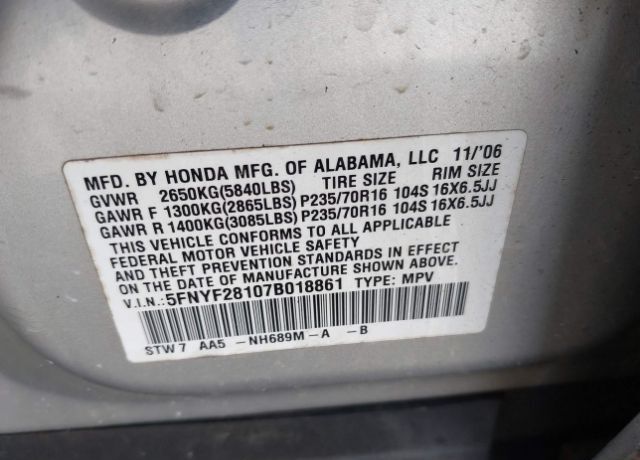 VIN 5FNYF28107B018861 may have been