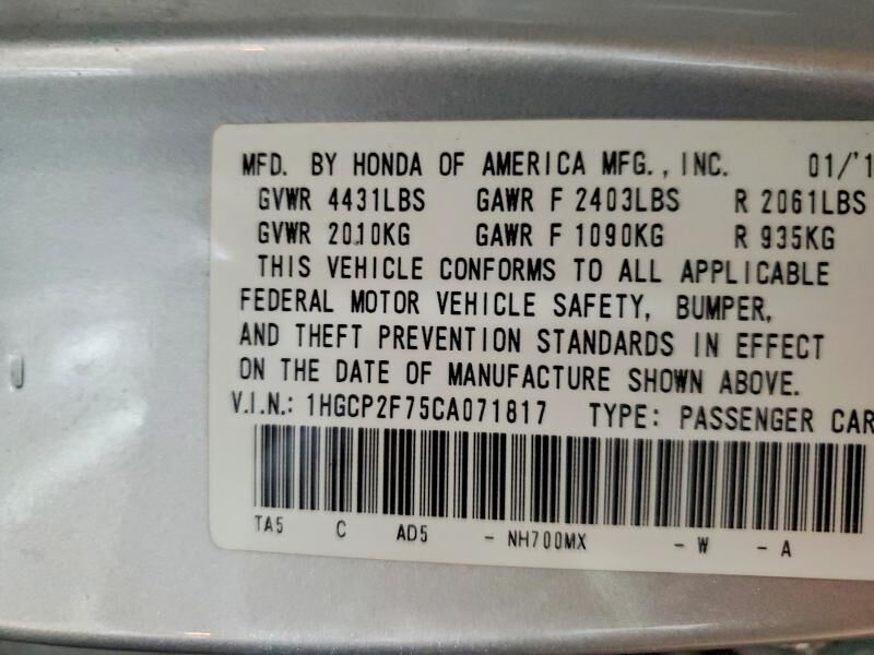 VIN 1HGCP2F75CA071817 may have been