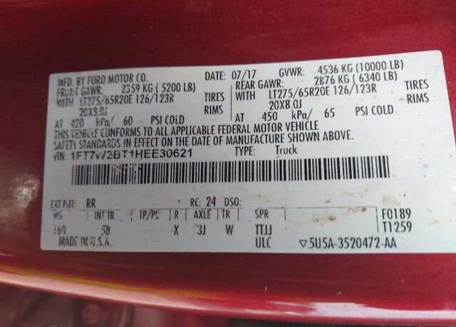 VIN 1FT7W2BT1HEE30621 may have been