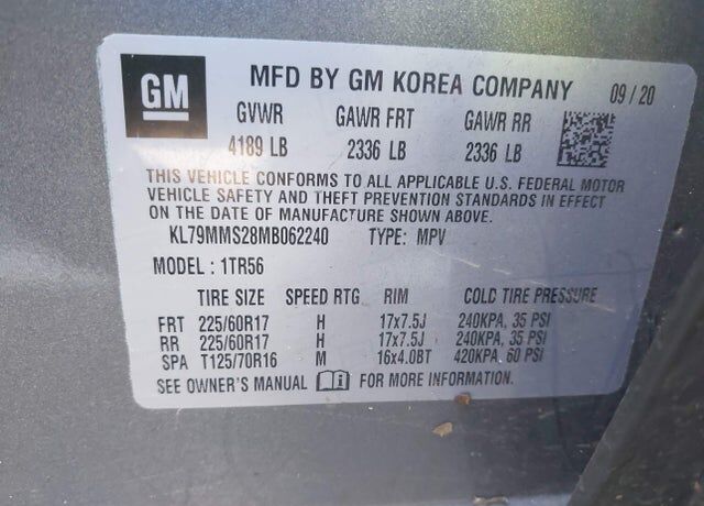 General Motors LLC (GM) is recalling certain 2021 Chevrolet Trailblazer vehicles factory-equipped with optional 17-inch sport terrain tires. The certification label on these vehicles does not provide the tire size and cold tire pressure information for front and rear tires, as required. As such, these vehicles fail to comply with Federal Motor Vehicle Safety Standard Number 110, "Tire Selection and Rims."