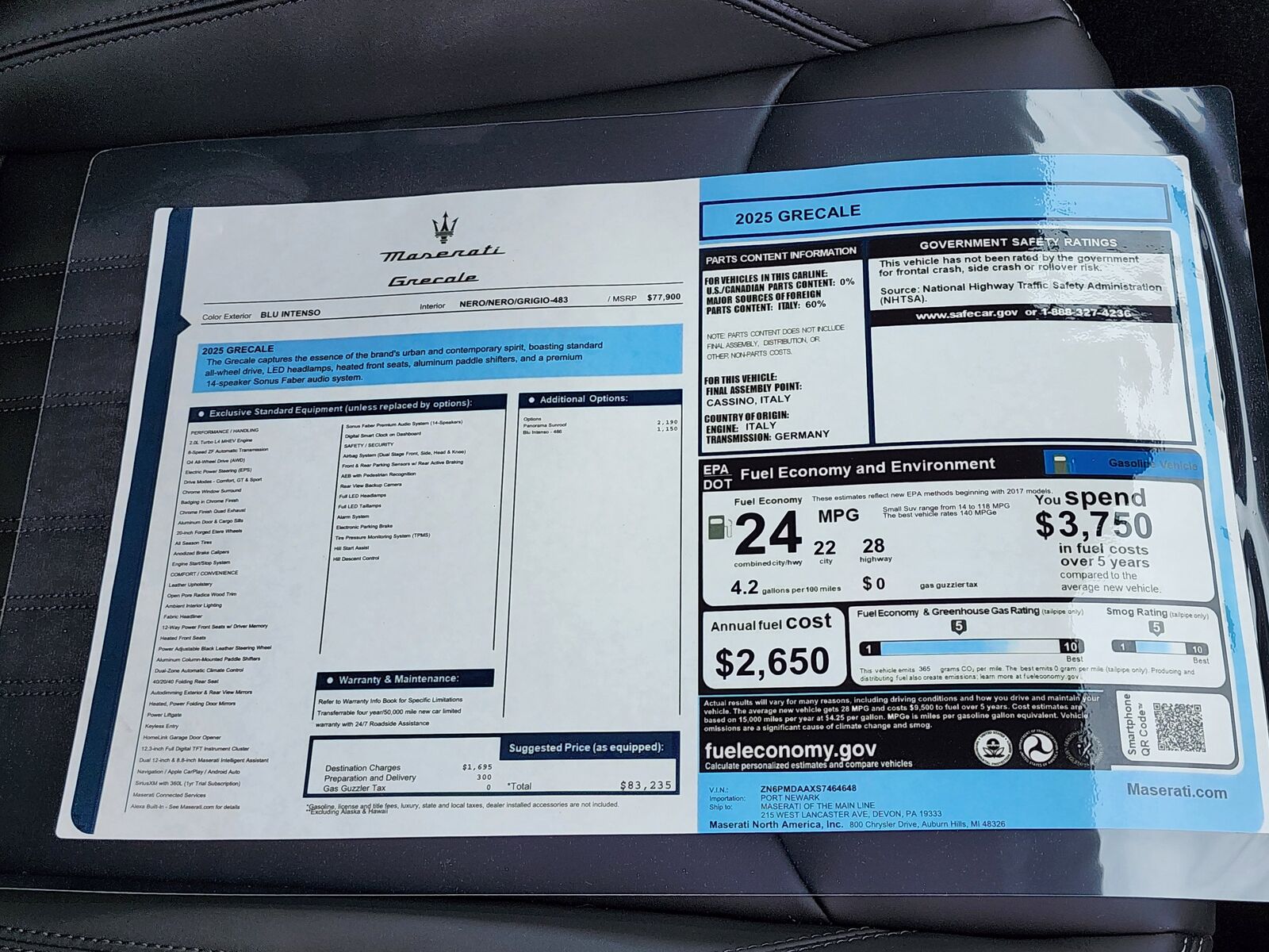 Radio: Sonus Faber 860 Watts Premium Audio System -inc: 14 speakers w/subwoofer Maserati Intelligent Assistant (MIA) 12.3" upper touchscreen 8.8" lower touchscreen navigation HD radio SiriusXM radio w/1-year trial subscription wired and wireless Apple CarPlay and Android Auto Maserati connected services w/trial subscriptions Alexa in-vehicle voice assistant and eCall and bCall w/trial subscriptions