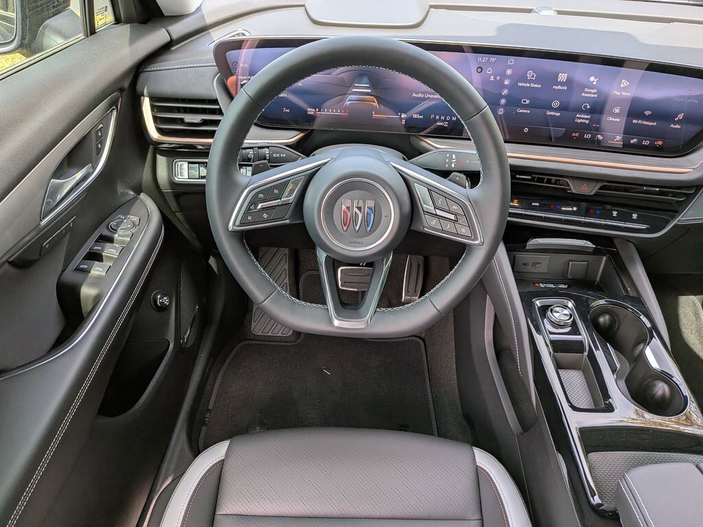 Leather-wrapped flat-bottom steering wheel