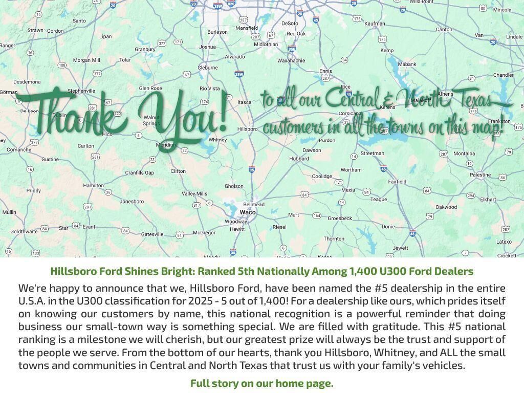 Hillsboro Ford is located 35 miles North of Waco, South of Waxahachie, and right off Interstate 35. Folks from Hillsboro, Whitney, West, Waco, Aquilla, Cleburne, Waxahachie, and Corsicana have been doing business with Hillsboro Ford for decades. Come...