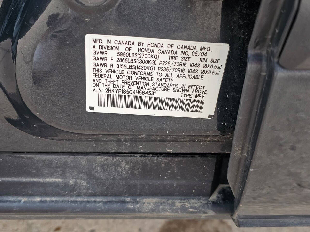 VIN 2HKYF18504H584531 may have been