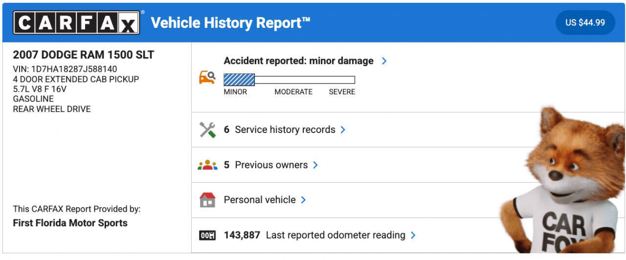 To be more confident in your used car purchase and get more information about the auto, including its accident history, insurance records, odometer readings history and other important details, we recommend you get a vehicle history report for the car prior to buying it.