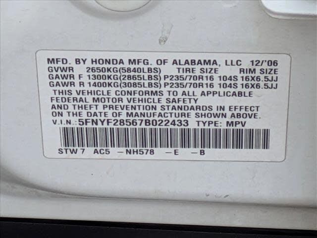 VIN 5FNYF28567B022433 may have been