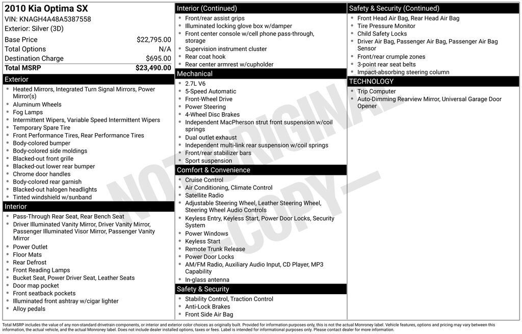 Recent Arrival!2010 Kia Optima SXThis vehicle is being sold AS-IS. Please ask about mechanical issues.***AUTOCHECK ONE OWNER VEHICLE***, ***Clean Vehicle History***, 2.7L V6 DOHC, Black w/Sport-Cloth/Leather Seat Trim.Silver SX FWD 2.7L V6 DOHC20/28...