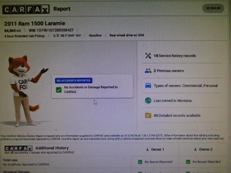 CARFAX CERTIFIED 1 ONE OWNER NO ACCIDENTS BUYBACK GUARANTEED! LOW MILES 84K! 2011 Ram 1500 Laramie, CLEAN CARFAX One-Owner 4WD 4X4 AWD, 5-Speed Automatic HEMI 5.7L V8 Multi Displacement VVT, Legendary 5.7L V8 delivers powerful performance, confidence...