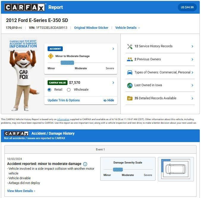 This 2012 Ford E-350 is a heavy-duty spacious and versatile full-size van built for work or passenger transport. Runs and drives great. Clean title. Never been in any major accident! Walkaround video and carfax available. Key features: - Heavy-...
