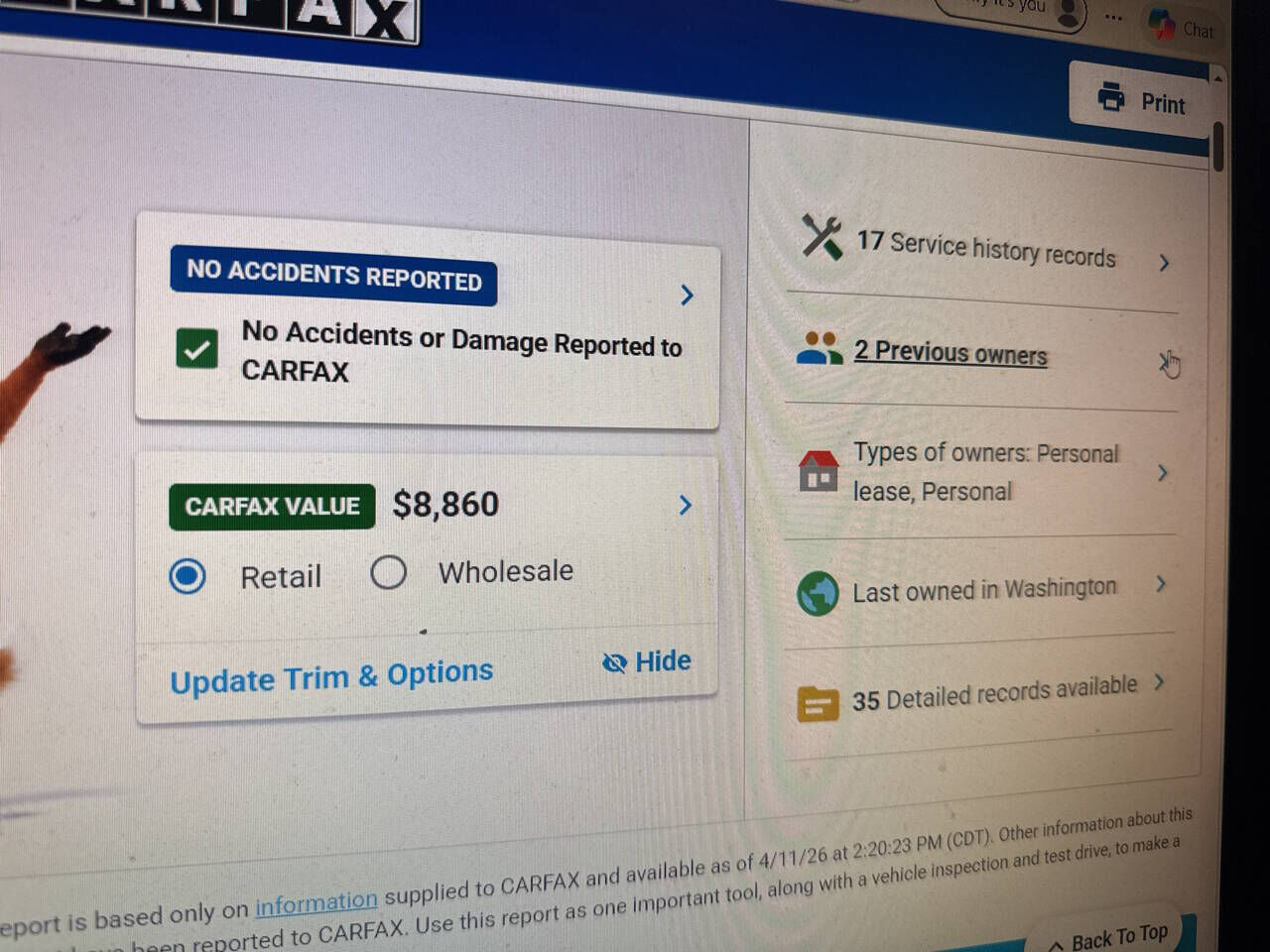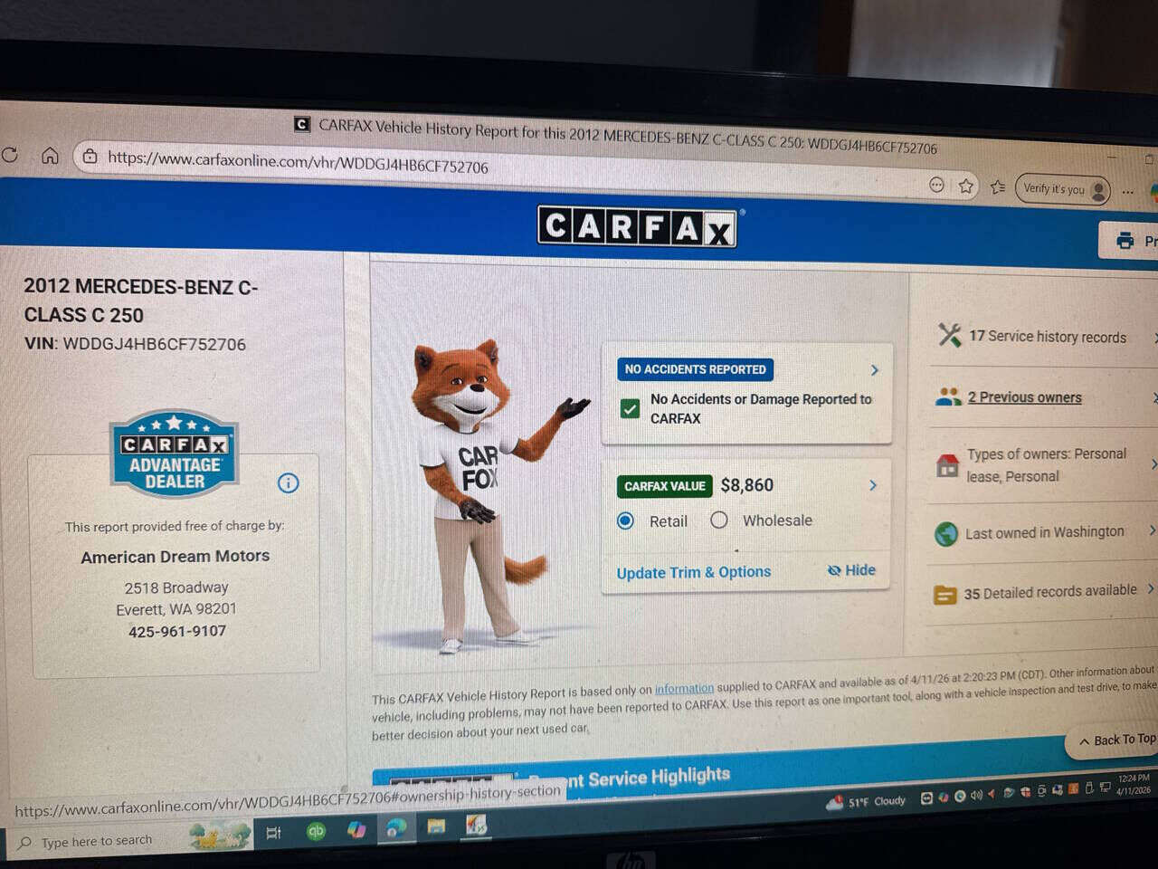 To be more confident in your used car purchase and get more information about the auto, including its accident history, insurance records, odometer readings history and other important details, we recommend you get a vehicle history report for the car prior to buying it.