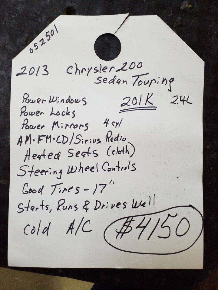2013 Chrysler 200 with 201k miles.This car has the 2.4L 4 cylinder engine and 6-speed automatic transmission. It also has power windows, power locks, power mirrors, AM-FM-CD/Sirius Radio, heated seats and steering wheel controls. Has good tire and dr...