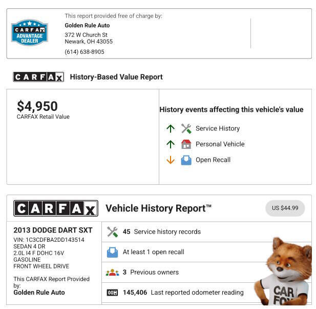 GOLDEN RULE AUTO372 W Church, Newark Oh 43055Showings available by appointmentTRADE INS WELCOME & FINANCING AVAILABLE at GOLDENRULEOHIO.COM ***CARFAX CERTIFIED 2013 Dodge Dart SXT**** MARCH MADNESS BLOWOUT $3,999 CASH DISCOUNT THIS WEEKEND ONLY* Pric...