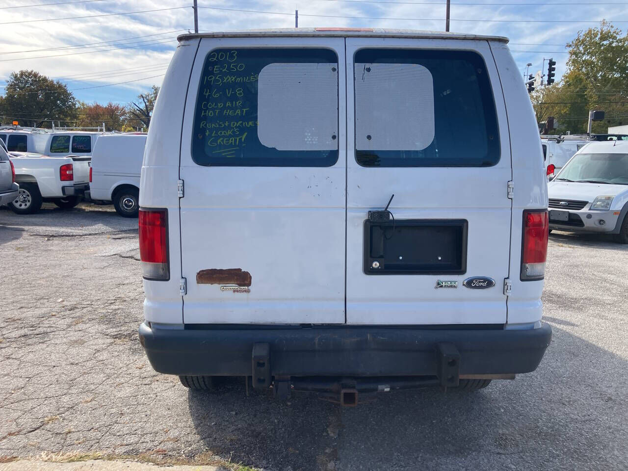 This 2013 Ford E-250 has the 4.6 V-8 with 195,654 miles but a very nice van. It has Cold air, power windows, power door locks, tilt, cruise control, Tow package, and the last owner put a nice audio system and a back up camera. It has a nice Set of Pa...