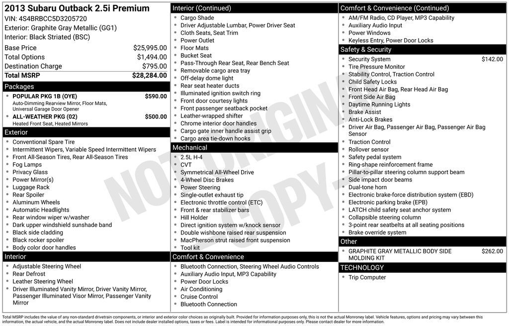 Graphite Gray Metallic 2013 Subaru Outback 2.5i Premium AWD CVT Lineartronic 2.5L 4-Cylinder DOHC 16V 17" x 7.0" Aluminum Alloy w/Silver Finish Wheels, 3.9 Axle Ratio, 4-Wheel Disc Brakes, 6 Speakers, ABS brakes, Air Conditioning, All Weather Floor M...