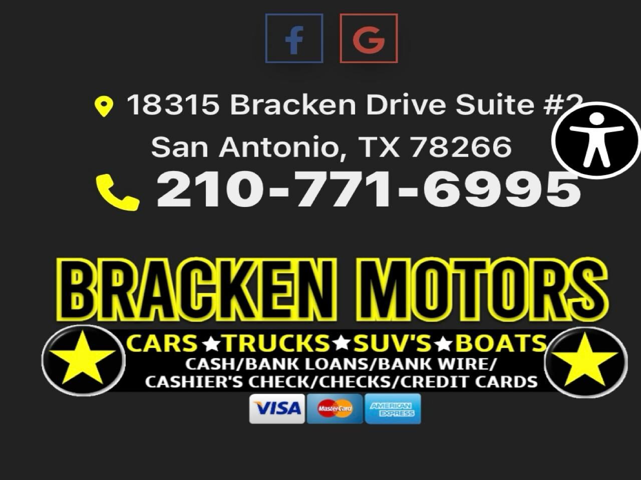 Visit Bracken Motors online at www.shopbrackenmotors.com to see more pictures of this vehicle or call us at 210-771-6995 today to schedule your test drive.Accepted forms of PaymentNavy Federal Credit UnionRandolph Brooks Federal Credit UnionUSAA Fede...