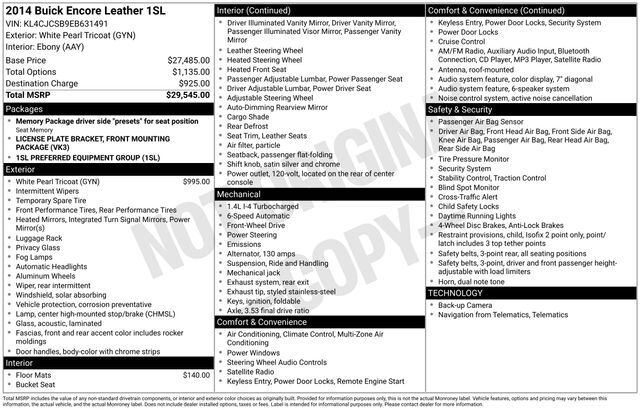 Odometer is 11640 miles below market average! 25/33 City/Highway MPG White Pearl Metallic 2014 Buick Encore Leather FWD 6-Speed Automatic ECOTEC 1.4L I4 SMPI DOHC Turbocharged VVT GOOD TIRES, GOOD BRAKES, 120-Volt Power Outlet, 1SL Equipment Group,...