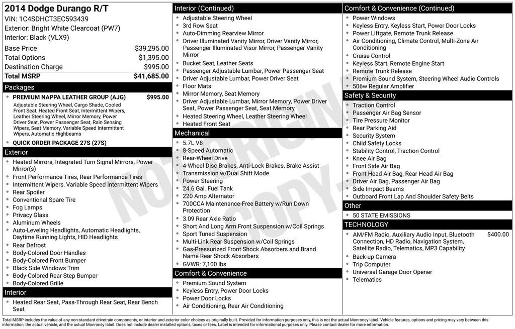 Clean CARFAX. Bright White Clearcoat 2014 Dodge Durango R/T RWD 8-Speed Automatic HEMI 5.7L V8 Multi Displacement VVT Need Financing? We have competitive financing terms available, with over 20 lending institutions available. We can provide financi...