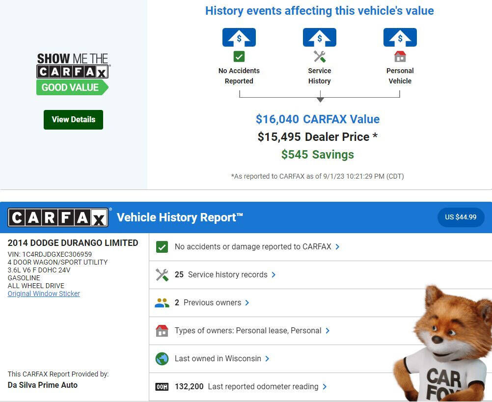 To be more confident in your used car purchase and get more information about the auto, including its accident history, insurance records, odometer readings history and other important details, we recommend you get a vehicle history report for the car prior to buying it.