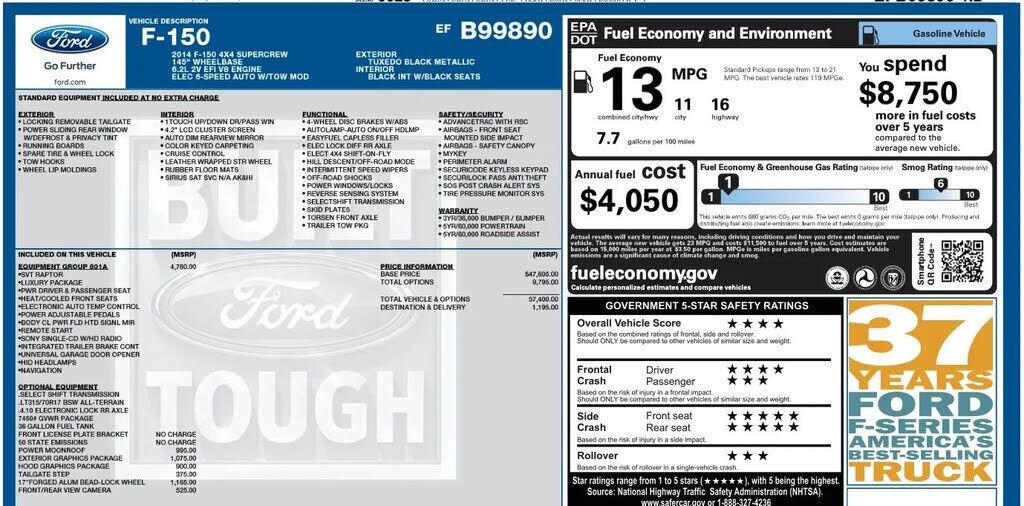 ADDED FEATURES:SVT RAPTORLUXURY PACKAGEPWR DRIVER & PASSENGER SEATHEAT/COOLED FRONT SEATSELECTRONIC AUTO TEMP CONTROLPOWER ADJUSTABLE PEDALSBODY CL PWR FLD HTD SIGNL MIRREMOTE STARTSONY SINGLE-CD W/HD RADIOINTEGRATED TRAILER BRAKE CONTUNIVERSAL GARAG...