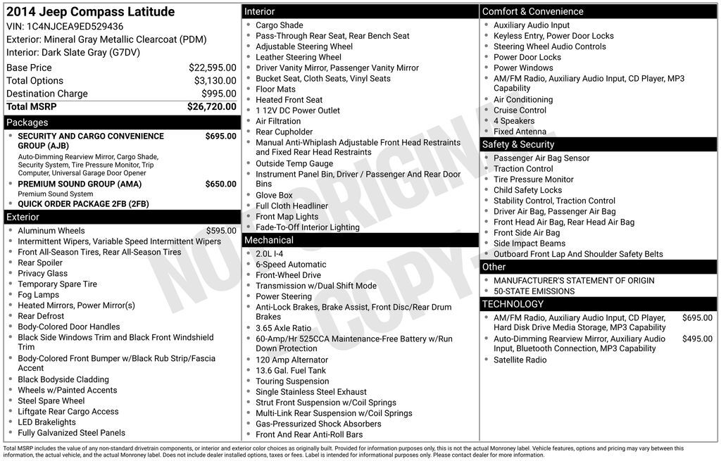 2014 Jeep Compass Latitude Mineral Gray Metallic Clearcoat Latitude FWD 6-Speed Automatic 2.0L I4 DOHC 16V Dual VVT 1-Year SiriusXM Radio Service, 16" x 6.5" Aluminum Wheels, 17" x 6.5" Aluminum Wheels, 2 Articulating Liftgate Speakers, 3.65 Axle Rat...