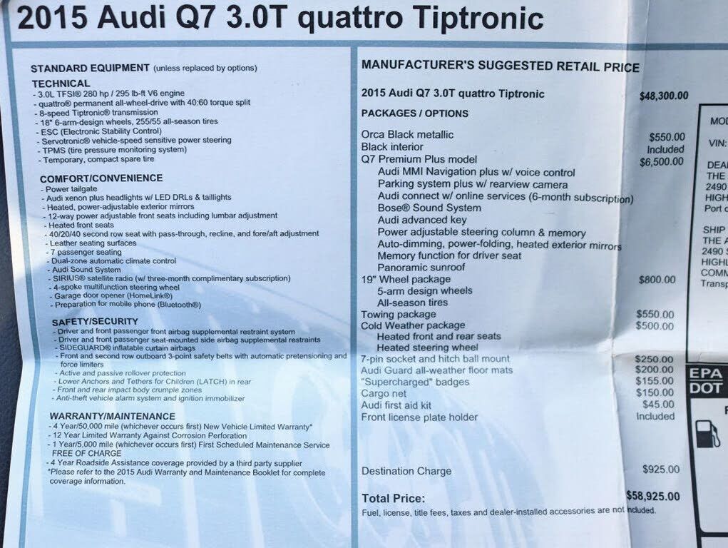 This 2015 Audi Q7 4dr quattro 4dr 3.0T Premium Plus features a 3.0L V6 CYLINDER 6cyl Gasoline engine. It is equipped with a 8 Speed Automatic transmission. The vehicle is Orca Black Metallic with a Black Leather interior. It is offered As-Is, extende...