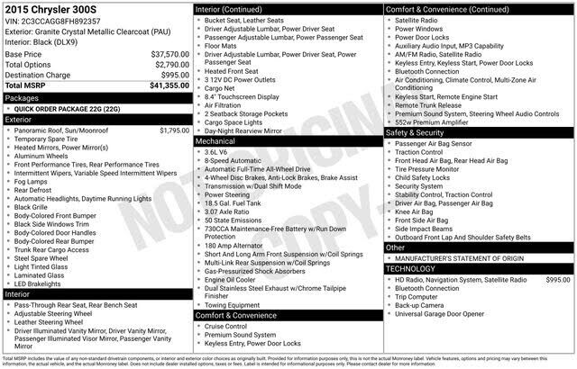 Recent Arrival! 2015 Chrysler 300 S 3.6L V6 24V VVT 8-Speed Automatic AWD 4D Sedan Granite Crystal Metallic Clearcoat For better peace of mind all our used vehicles have a 127-point inspection and come with a 5-day return, 30-day exchange (As-Is ve...