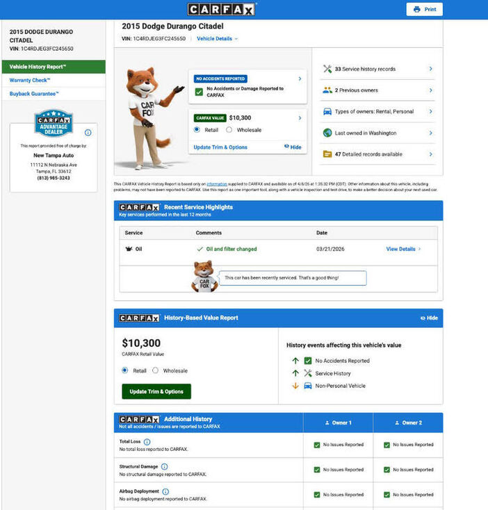 2015 Dodge Durango Citadel VIN: 1C4RDJEG3FC245650 Vehicle Details 4 Door Wagon/Sport Utility 3.6L V6 F DOHC 24V Gasoline All wheel drive CLEAN CARFAX Thank you for your interest. The vehicle is available and ready for viewing Location: NEW TAMPA...