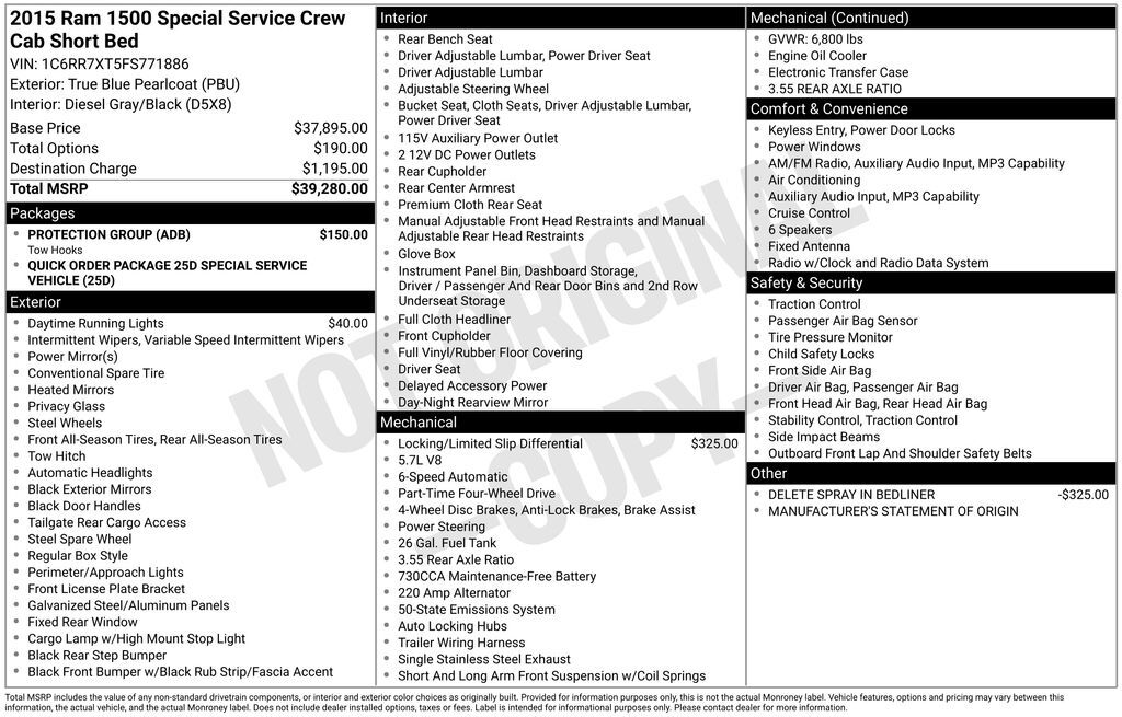Recent Arrival! 2015 Ram 1500 SSV True Blue Pearlcoat 115V Auxiliary Power Outlet, 17" x 7" Steel Wheels, 3.55 Rear Axle Ratio, 4-Wheel Disc Brakes, 6 Speakers, ABS brakes, Air Conditioning, AM/FM radio, Anti-Spin Differential Rear Axle, Black Exteri...