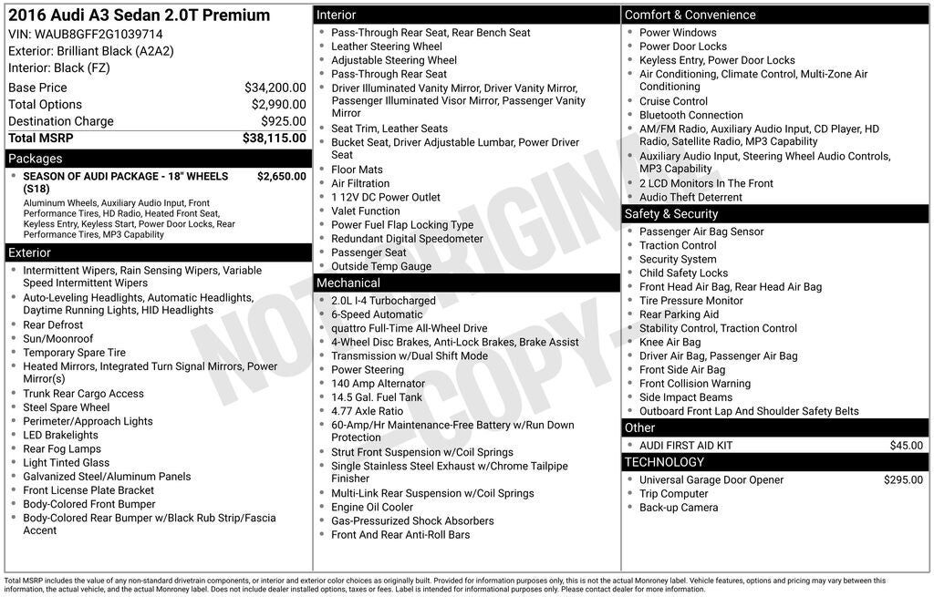 Radio: Audi Concert AM/FM/1CD Player -inc: MP3 capable SiriusXM satellite radio w/90-day trial subscription 12-station presets speed-dependent volume control Audi sound system w/10 speakers w/180 watts including subwoofer 6-channel amplifier and Bluetooth® streaming audio