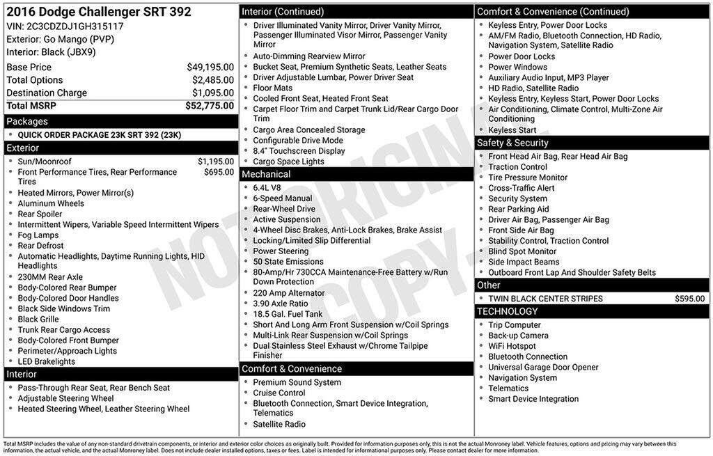 Go Mango 2016 Dodge Challenger SRT 392 Tremec 6-Speed Manual SRT HEMI 6.4L V8Awards: * JD Power Initial Quality Study (IQS) * JD Power Initial Quality Study (IQS) Vehicle Dependability Study * JD Power Initial Quality Study (IQS) Vehicle Dependa...