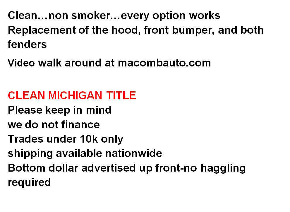 Cleannon smokerevery option works Replacement of the hood, front bumper, and both fenders Video walk around at macombauto.com CLEAN MICHIGAN TITLE Please keep in mind we do not finance Trades under 10k only shipping available nationwide Bo...