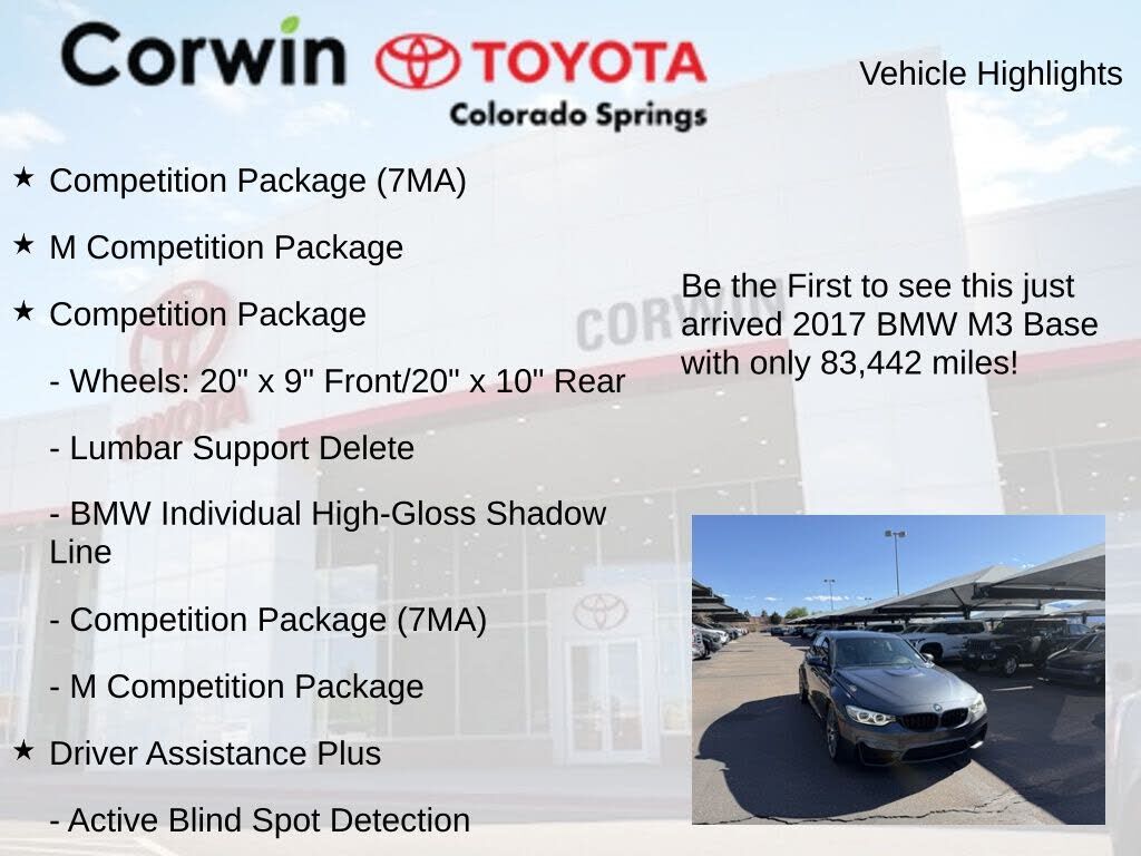 Discover the unparalleled performance and premium features of this exceptional 2017 BMW M3 Base. With its powerful 3.0L I6 engine, 6-speed manual transmission, and rear-wheel-drive configuration, this M3 delivers an exhilarating driving experience th...