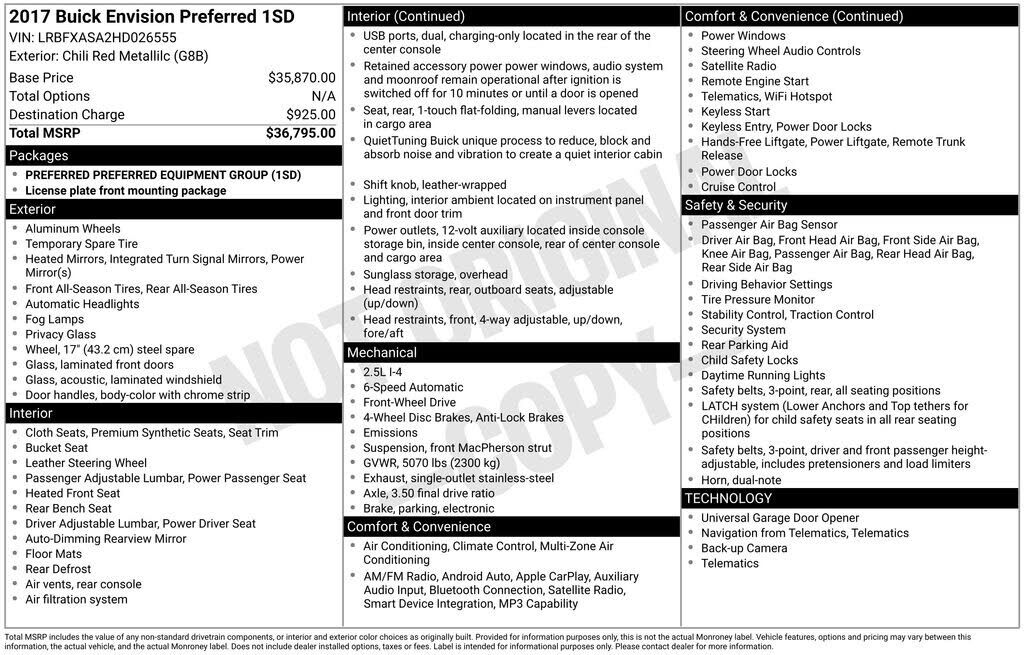 General Motors LLC (GM) is recalling certain 2016-2017 Buick Envision vehicles manufactured February 4, 2016, to April 25, 2016. The Tire and Loading Information label may display the incorrect maximum weight information. As such, these vehicles fail to comply with the requirements of Federal Motor Vehicle Safety Standard (FMVSS) number 110, "Tire Selection and Rims."