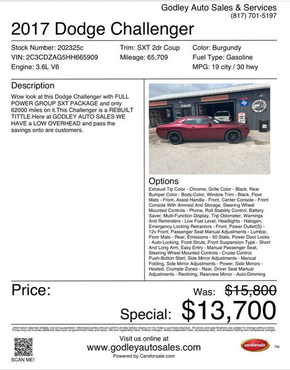 Wow look at this Dodge Challenger with FULL POWER GROUP SXT PACKAGE and only 62000 miles on it.This Challenger is a REBUILT TITTLE.Here at GODLEY AUTO SALES WE HAVE a LOW OVERHEAD and pass the savings onto are customers.