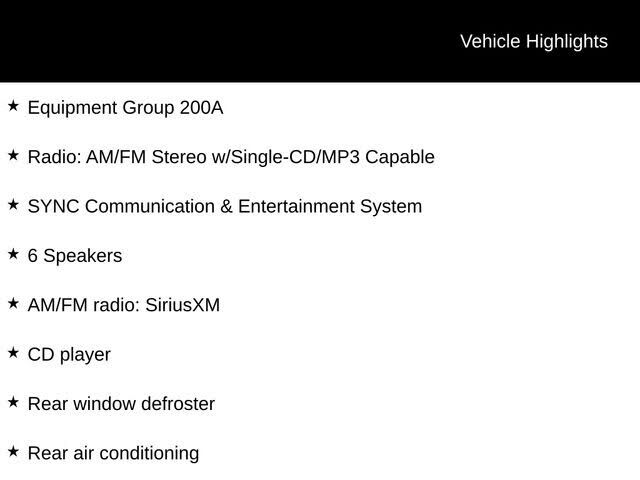 Equipment Group 200A,6 Speakers,AM/FM radio: SiriusXM,CD player,Radio: AM/FM Stereo w/Single-CD/MP3 Capable,SYNC Communication & Entertainment System,Air Conditioning,Rear air conditioning,Rear window defroster,Power driver seat,Power steering,Power...