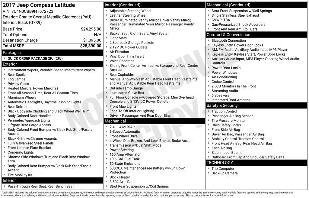 Chrysler (FCA US LLC) is recalling certain 2017 Jeep Compass vehicles equipped with a 6-speed transmission. The left front halfshaft may not be properly seated, and, as a result, it may disengage from the transmission and/or break.