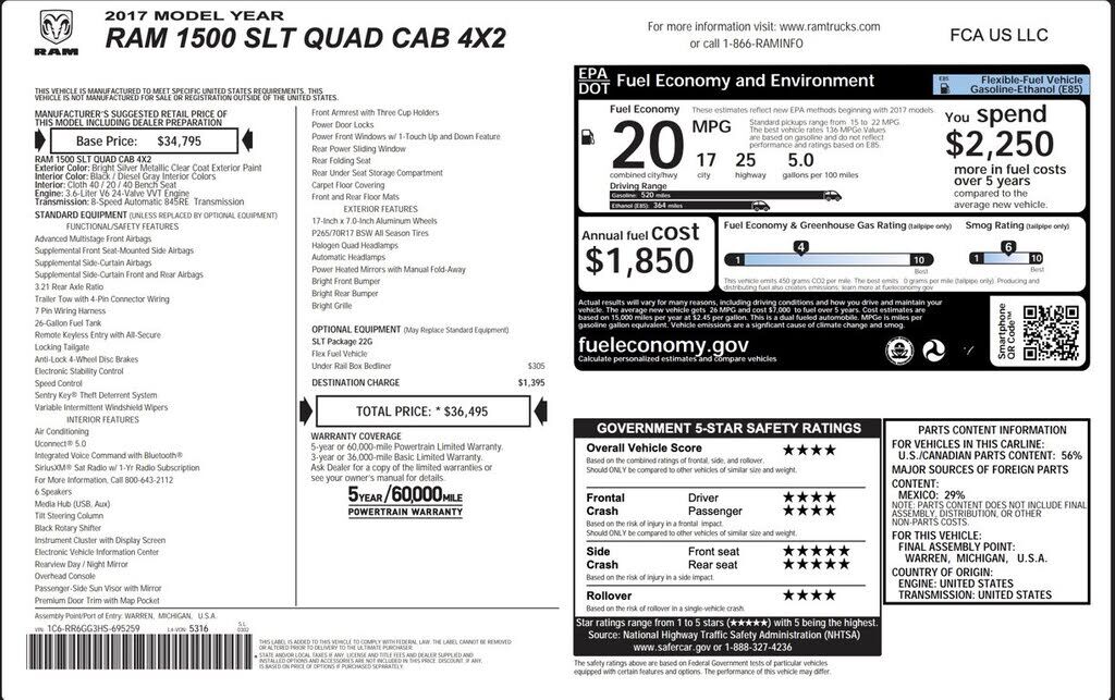 WHEELS: 17" X 7" ALUMINUM (STD), UNDER RAIL BOX BEDLINER, TRANSMISSION: 8-SPEED AUTOMATIC (845RE) (STD), TIRES: P265/70R17 BSW AS (STD), QUICK ORDER PACKAGE 22G SLT -inc: Engine: 3.6L V6 24V VVT, Transmission: 8-Speed Automatic (845RE), MANUFACTURER'...