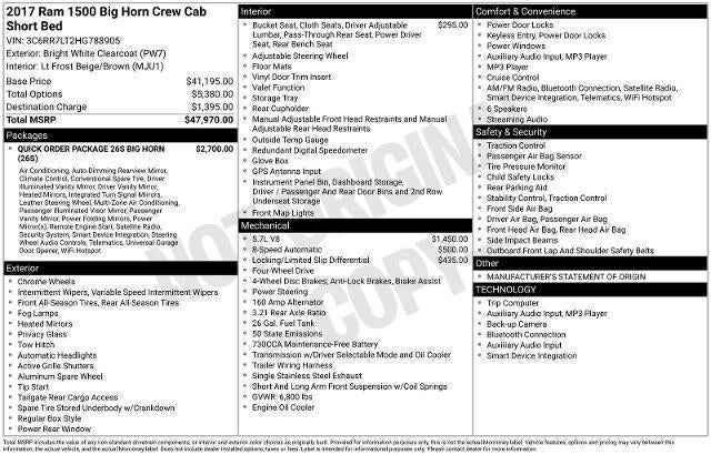 Discover the Powerful and Versatile 2017 Ram 1500 Big Horn - A Truck Built for Adventure This 2017 Ram 1500 Big Horn is a true workhorse, combining exceptional capability with refined comfort and style. Boasting a robust HEMI 5.7L V8 engine and 4-whe...