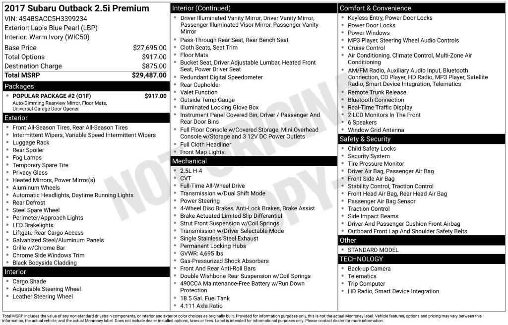 Subaru of America, Inc. (Subaru) is recalling certain 2016-2017 Outback vehicles. A replacement air bag control module may have been installed that is not compatible with the passenger air bag module, possibly affecting air bag deployment.