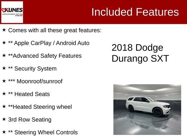 White Knuckle Clearcoat 2018 Dodge Durango SXT SXT Comes with all these great features:, ** Apple CarPlay / Android Auto, **Advanced Safety Features, ** Security System, *** Moonroof/sunroof, ** Heated Seats, **Heated Steering wheel, 3rd Row Seating,...