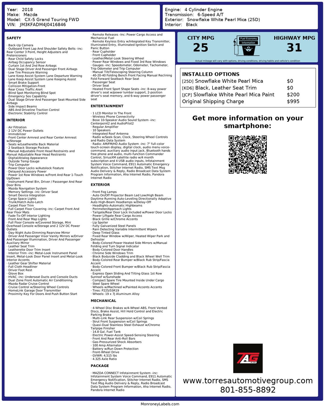 This Carfax 1-Owner 2018 Mazda CX-5 Grand Touring FWD presents an impressive blend of style, efficiency, and luxury, perfect for drivers seeking a dynamic driving experience with upscale comforts. The exterior boasts a captivating Snowflake White Pea...