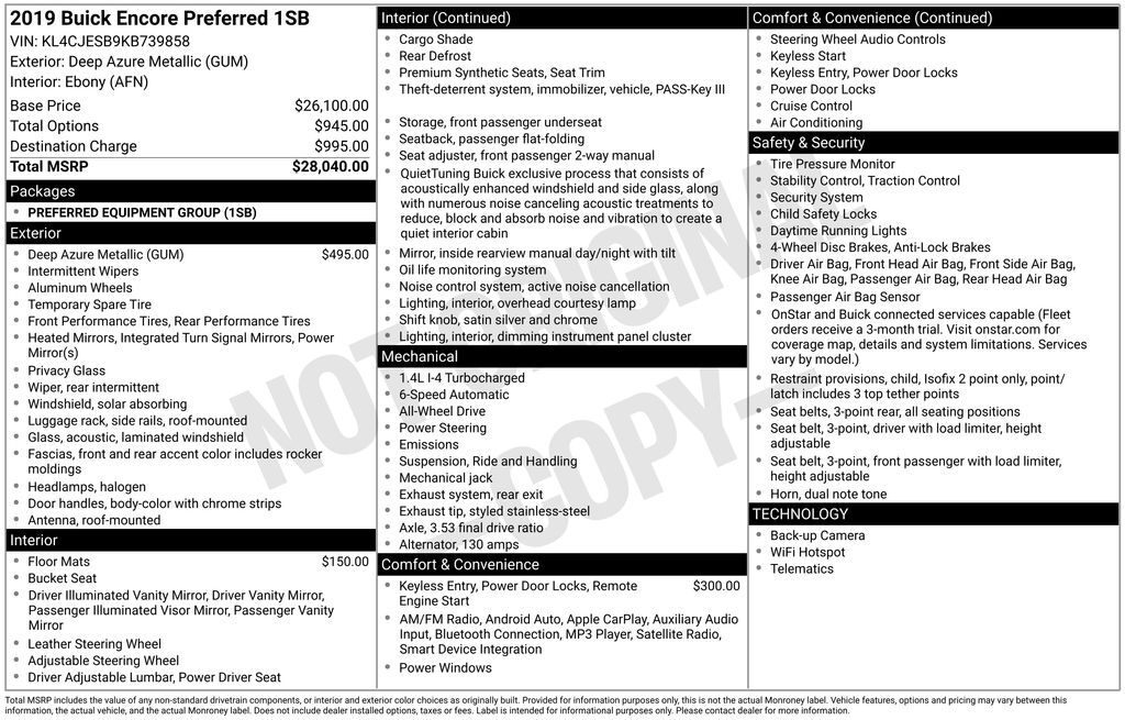Azure 2019 Buick Encore Preferred AWD 6-Speed Automatic Electronic with Overdrive ECOTEC 1.4L I4 SMPI DOHC Turbocharged VVT Local Trade, Preferred Equipment Group 1SB. Recent Arrival! 24/29 City/Highway MPG Awards: * JD Power Dependability StudyP...