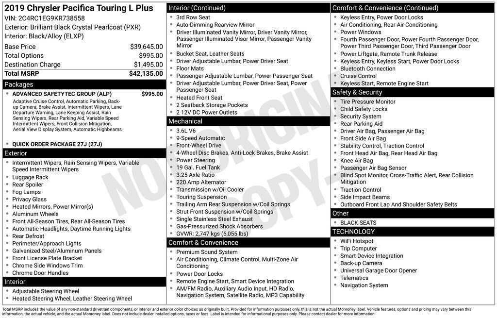 2019 Chrysler Pacifica 3.6L V6 2 OWNER WITH A CLEAN CAR-FAX! Has premium alloy wheels, leather seats, power seats, heated seats, heated steering wheel, third row seating, cruise control, hands free phone link, dual rear media entertainment screens,...