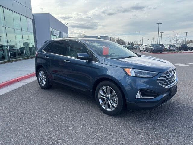 Recent Arrival! Blue 2019 Ford Edge Titanium 4D Sport Utility AWD 8-Speed Automatic EcoBoost 2.0L I4 GTDi DOHC Turbocharged VCT 21/28 City/Highway MPG Servicing the Bozeman, Butte, Billings, Great Falls, Missoula, Kalispell, Helena, and Great Sout...