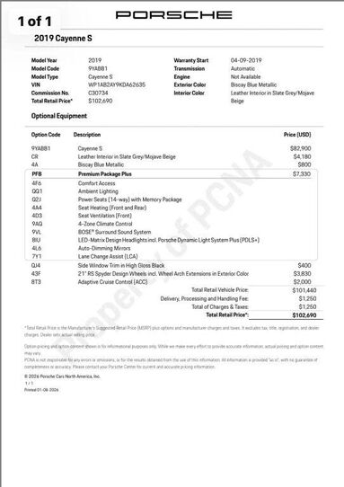 1-OwnerClean TitleClean CarFaxNo AccidentExterior Color: Biscay Blue MetallicInterior Color: Mojave BeigeOptional EquipmentOption Code Description Price (USD)9YABB1 Cayenne S $82,900CR Leather Interior in Slate Grey/Mojave Beige $4,1804A Bisca...