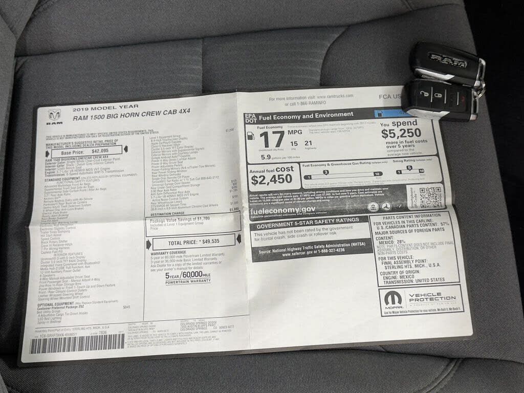 2019 RAM 1500 Big Horn/Lone Star 4X4 - 5.7L HEMI V85.7L HEMI V8 power.4X4 Crew Cab configuration.Diesel Gray/Black cloth bench seating.A well-equipped full-size truck built with real capability.Key Highlights5.7L HEMI V8 with MDS and VVT8-Speed Autom...