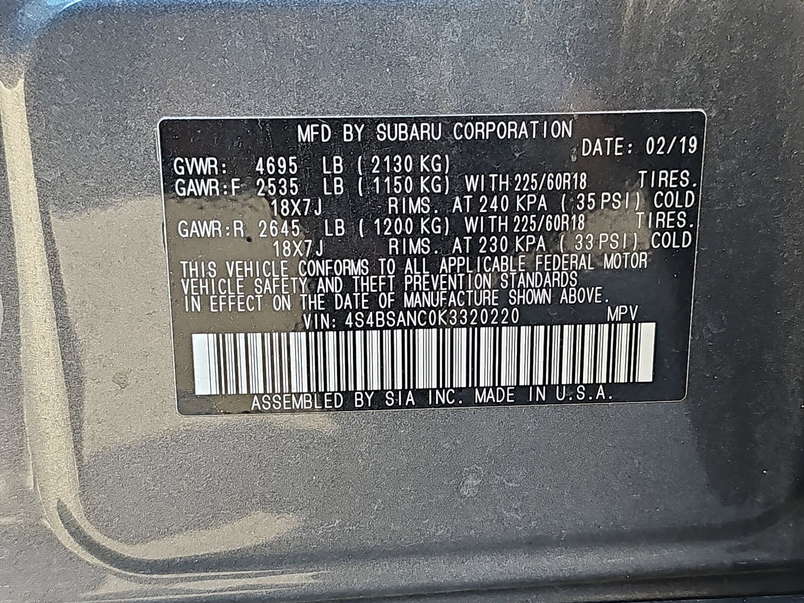 VIN 4S4BSANC0K3320220 may have been