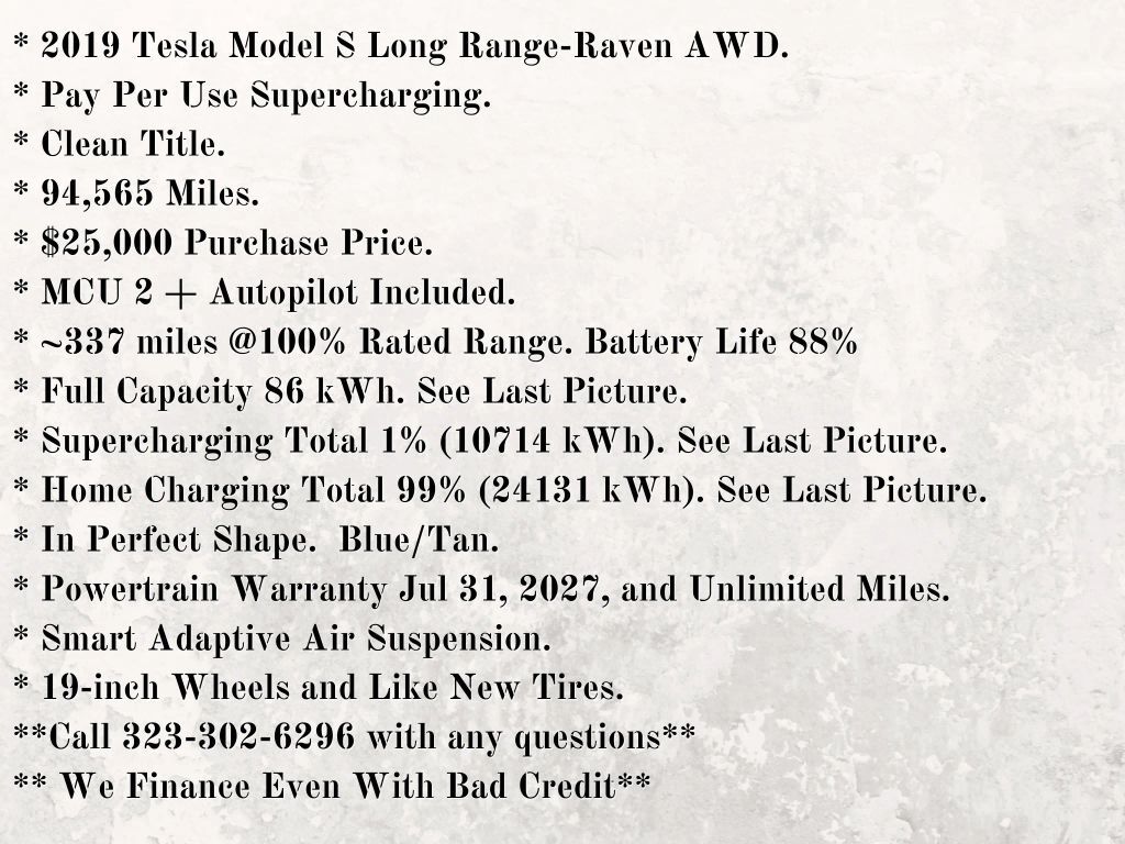 * 2019 Tesla Model S Long Range-Raven AWD.* Pay Per Use Supercharging.* Clean Title.* 94565 Miles.* $25000 Purchase Price.* MCU 2 + Autopilot Included.* ~337 miles at100% Rated Range. Battery Life 88%* Full Capacity 86 kWh. See Last Picture.* Superch...