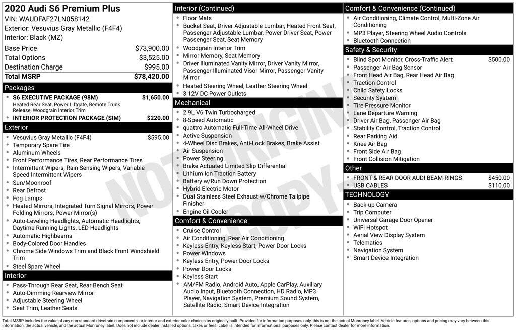 Gray 2020 Audi S6 2.9T Premium Plus quattro quattro 8-Speed Automatic with Tiptronic 2.9L V6 Turbocharged DOHC 24V LEV3-ULEV70 444hp Audi Side Assist w/Pre Sense Rear, Extended Leather Package, Heated Rear Seats, Multicolor Contour/Ambient LED Int Li...